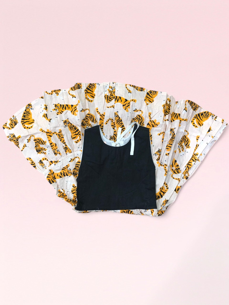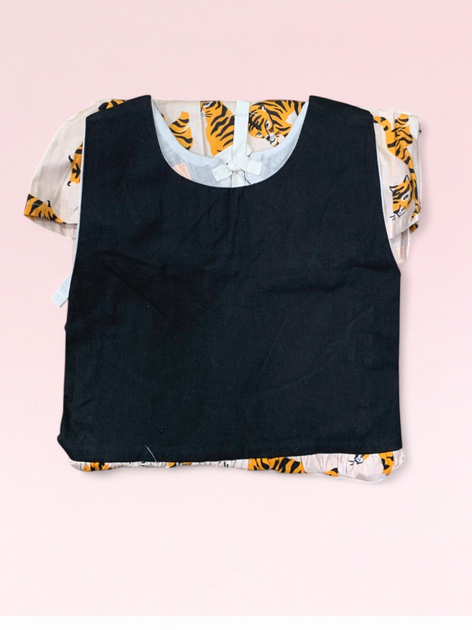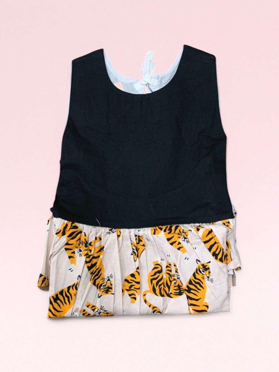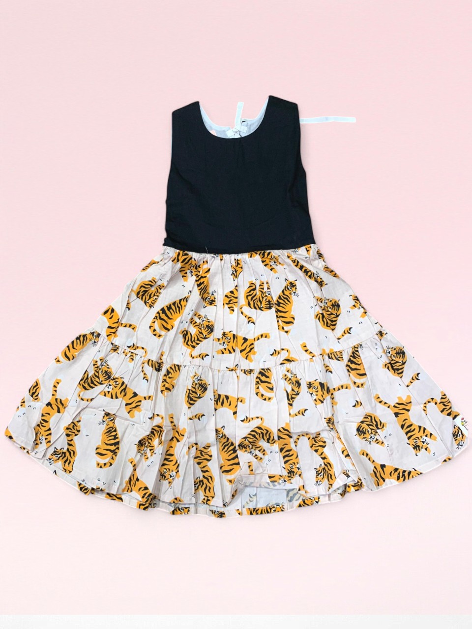A trendy and comfortable dress featuring a solid black sleeveless bodice paired with a vibrant tiger print flare skirt. Perfect for casual outings and special occasions.