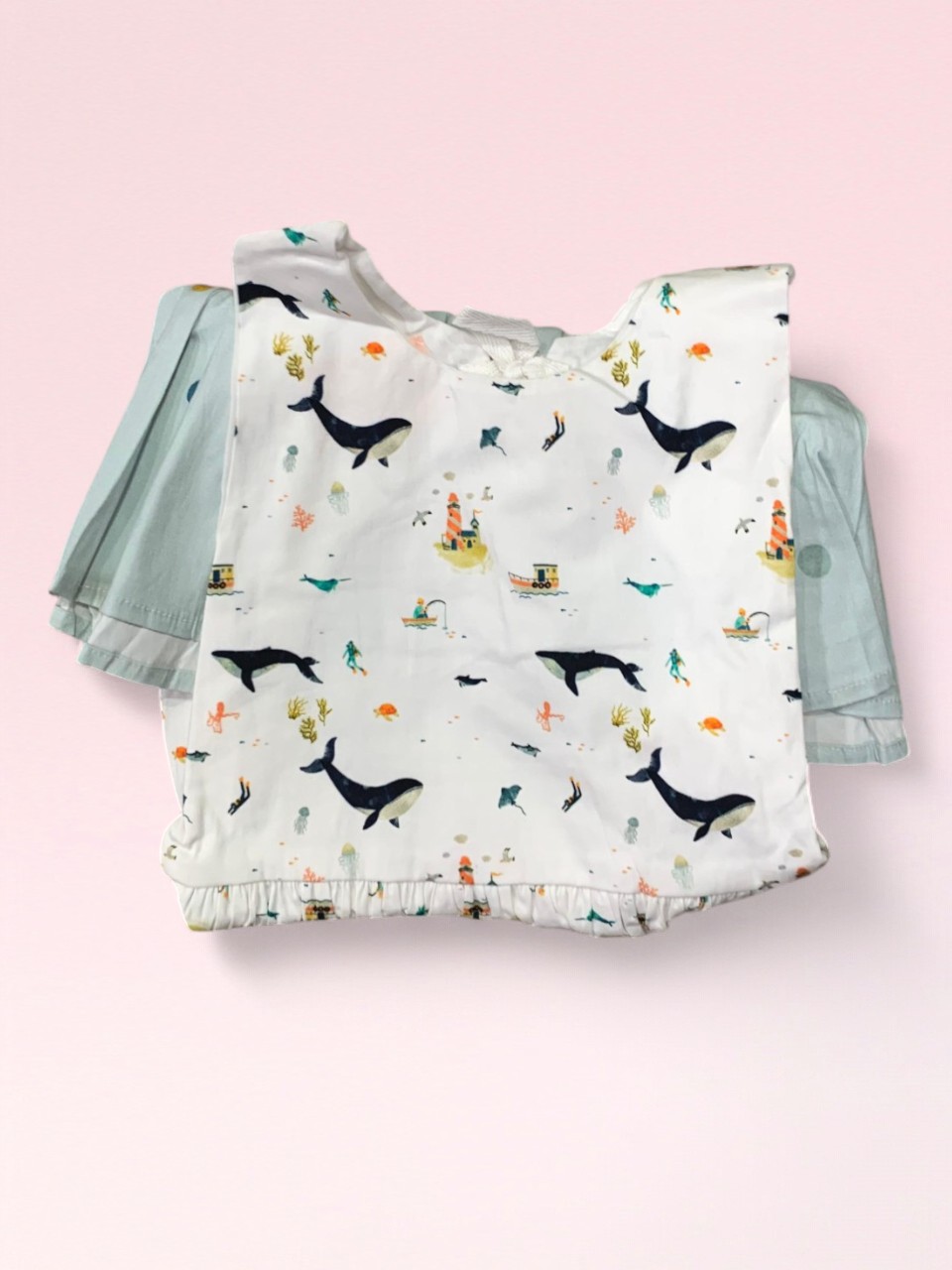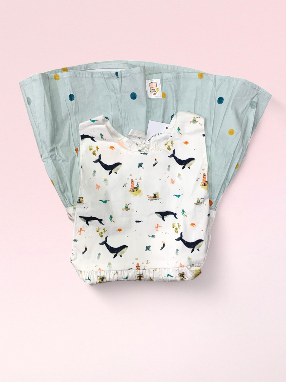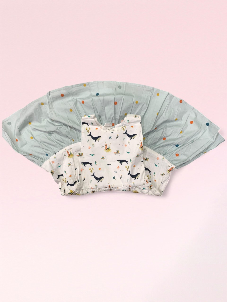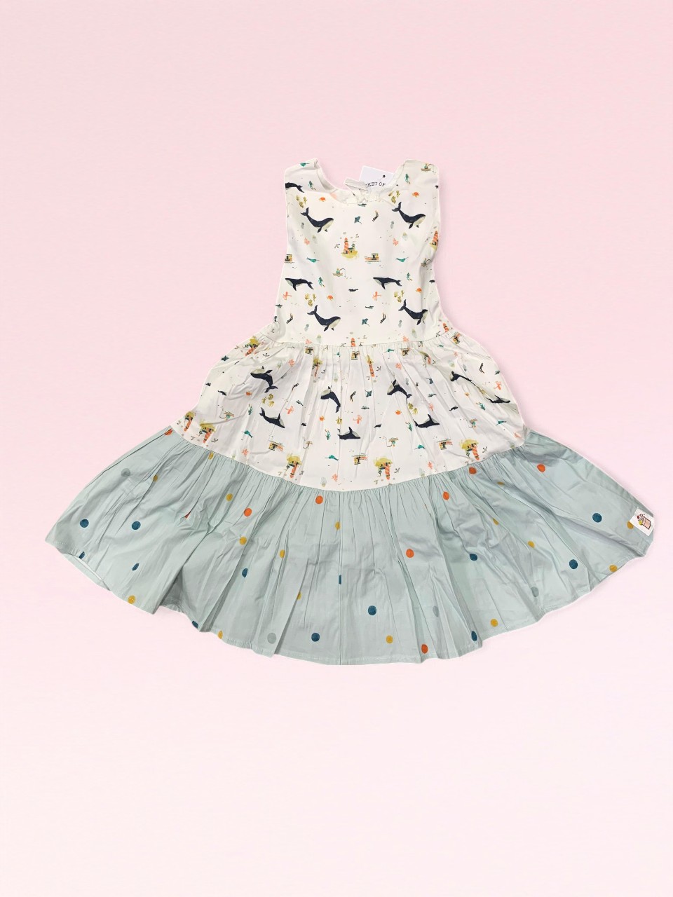 Stylish sleeveless dress with whimsical whale prints and a flowing polka-dot skirt, perfect for playful and party occasions.